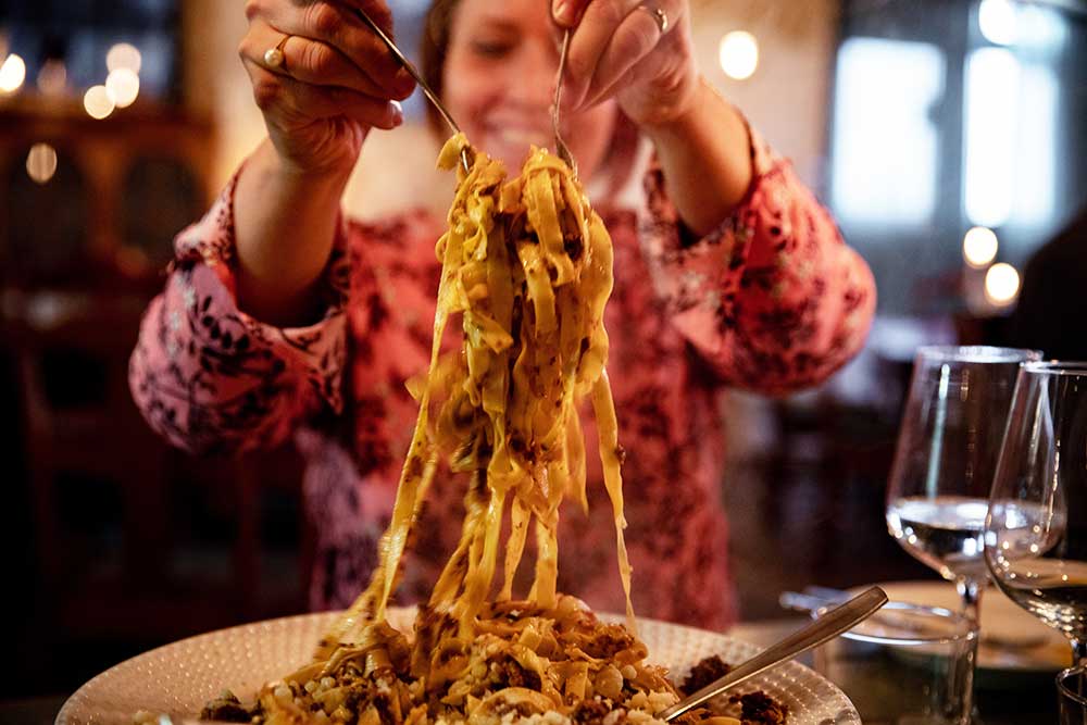 Här serveras hemgjord pasta på riktigt, nybakad foccacian och noga utvalda viner. Maten lagas till stor del av lokala råvaror, ekologiskt och i säsong. Läs mer...